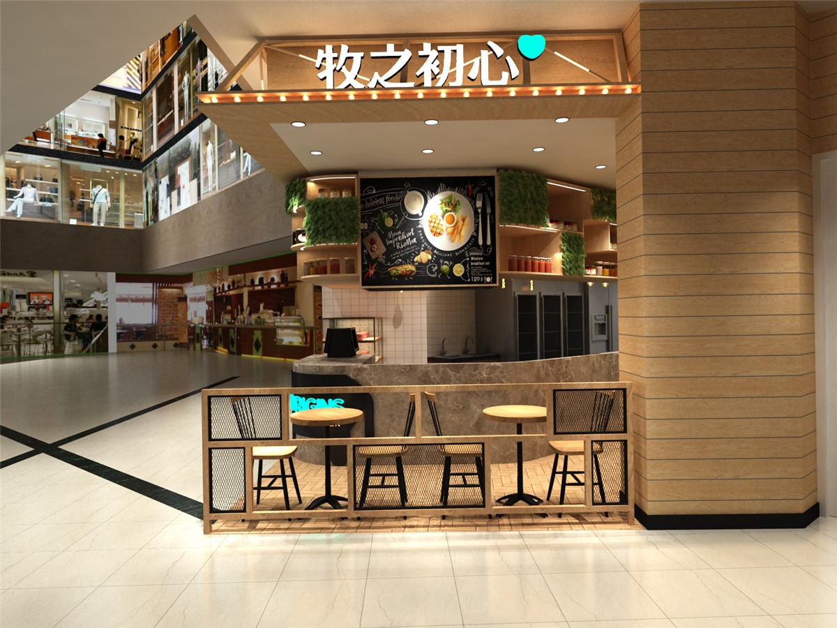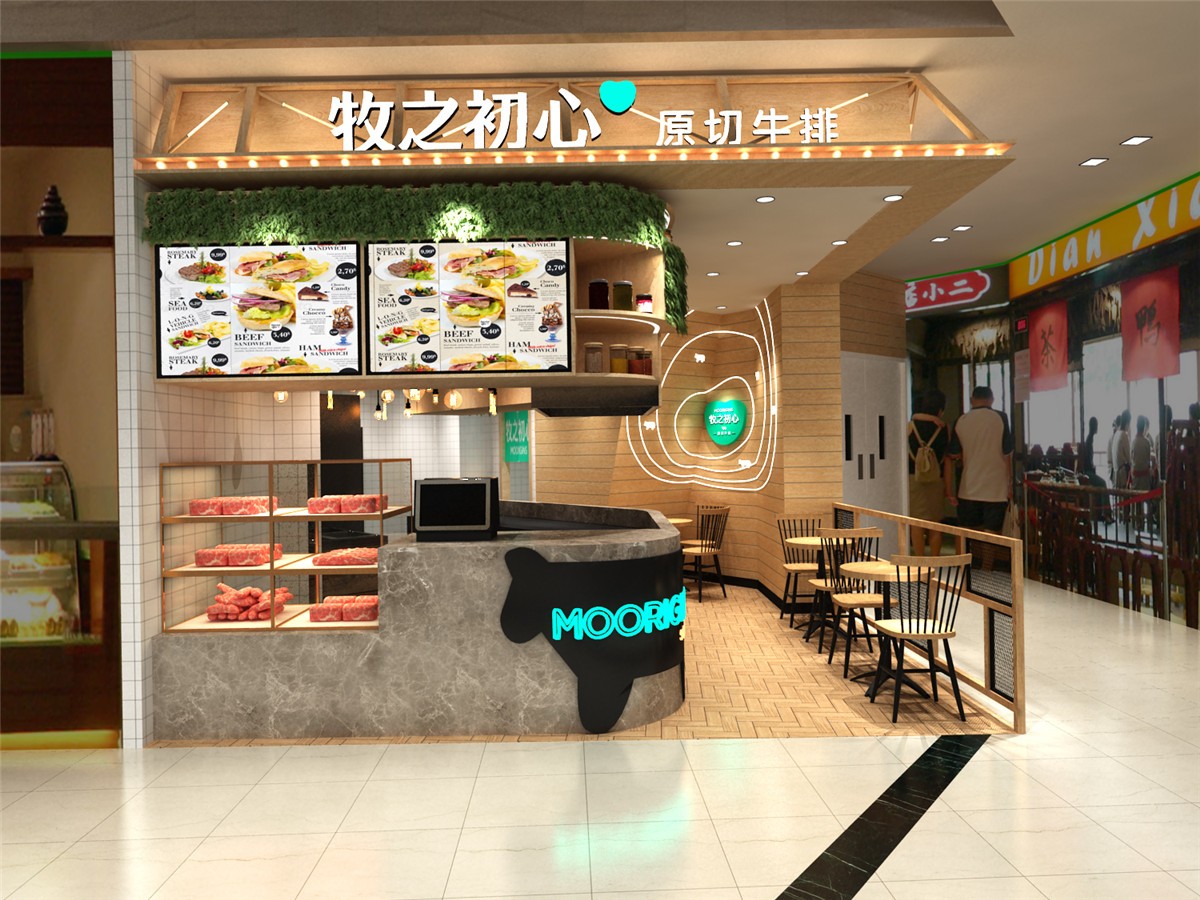 案例介紹:商場小餐飲店鋪,牧之初心牛排連鎖店,以原木色為主色調,打造自然北歐風情。