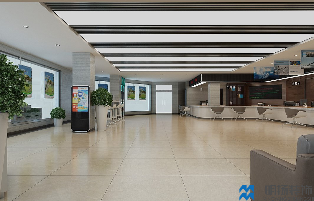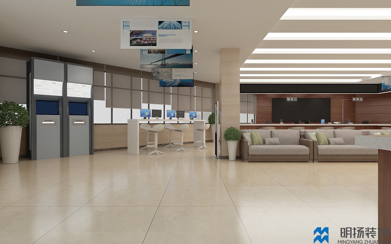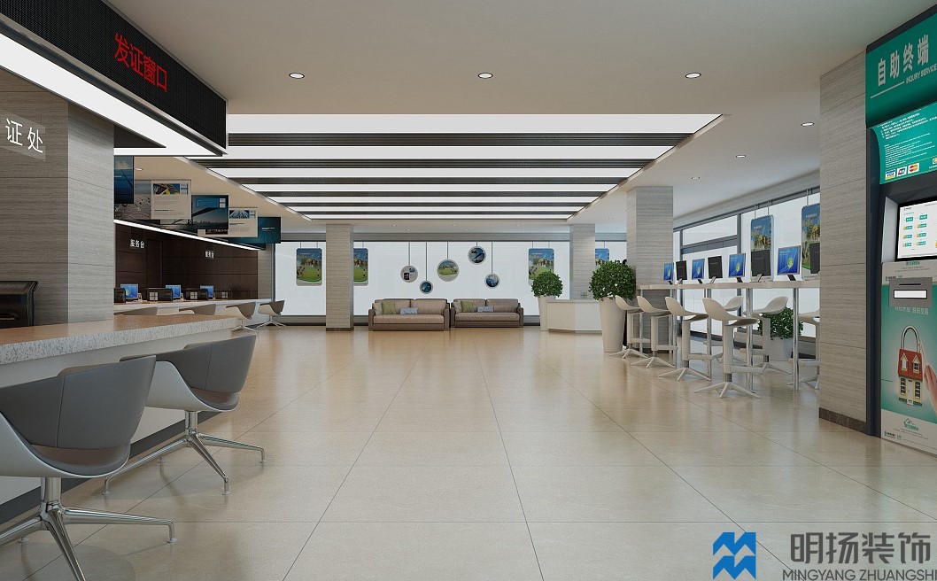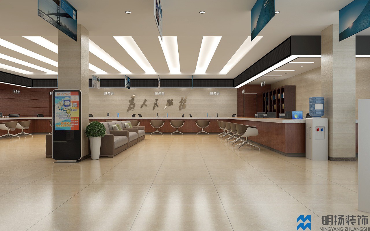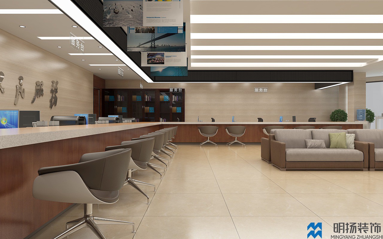 成都某政務(wù)大廳裝修效果圖,采用米色,白色,褐色等帶溫馨色調(diào)的顏色風(fēng)格,充分體現(xiàn)辦事處盡職盡責(zé),體恤民眾的氛圍。